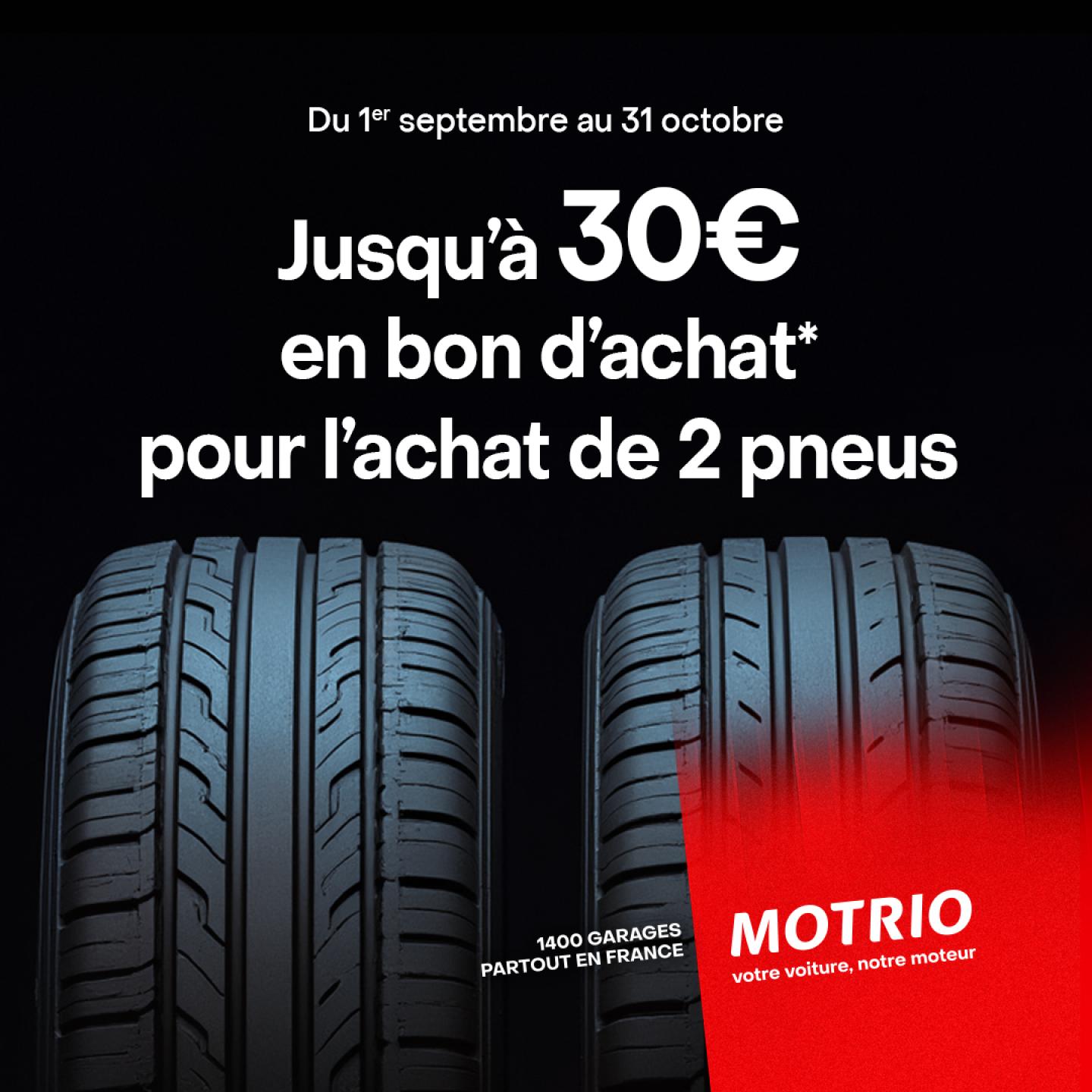 Pour tout achat de 4 pneus Motrio, vous recevez 30€ en bon d'achat, et pour tout achat de 2 pneus Motrio, vous recevez un bon d'achat de 15€ TTC, valable 18 mois et mentionné sur la facture.